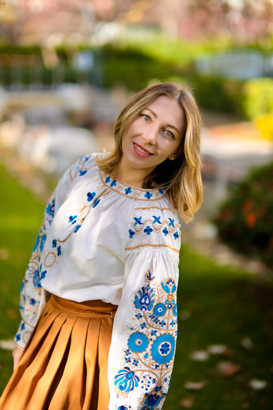Nezlamna – White Embroidered Blouse with Golden & Blue “Tree of Life” Details | Ukrainian Women’s Shirt