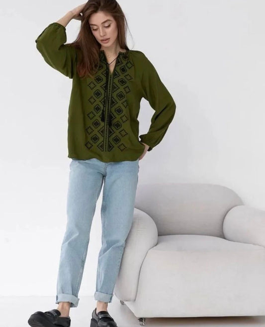 Myroslava Khaki Blouse with Black Geometric Embroidery