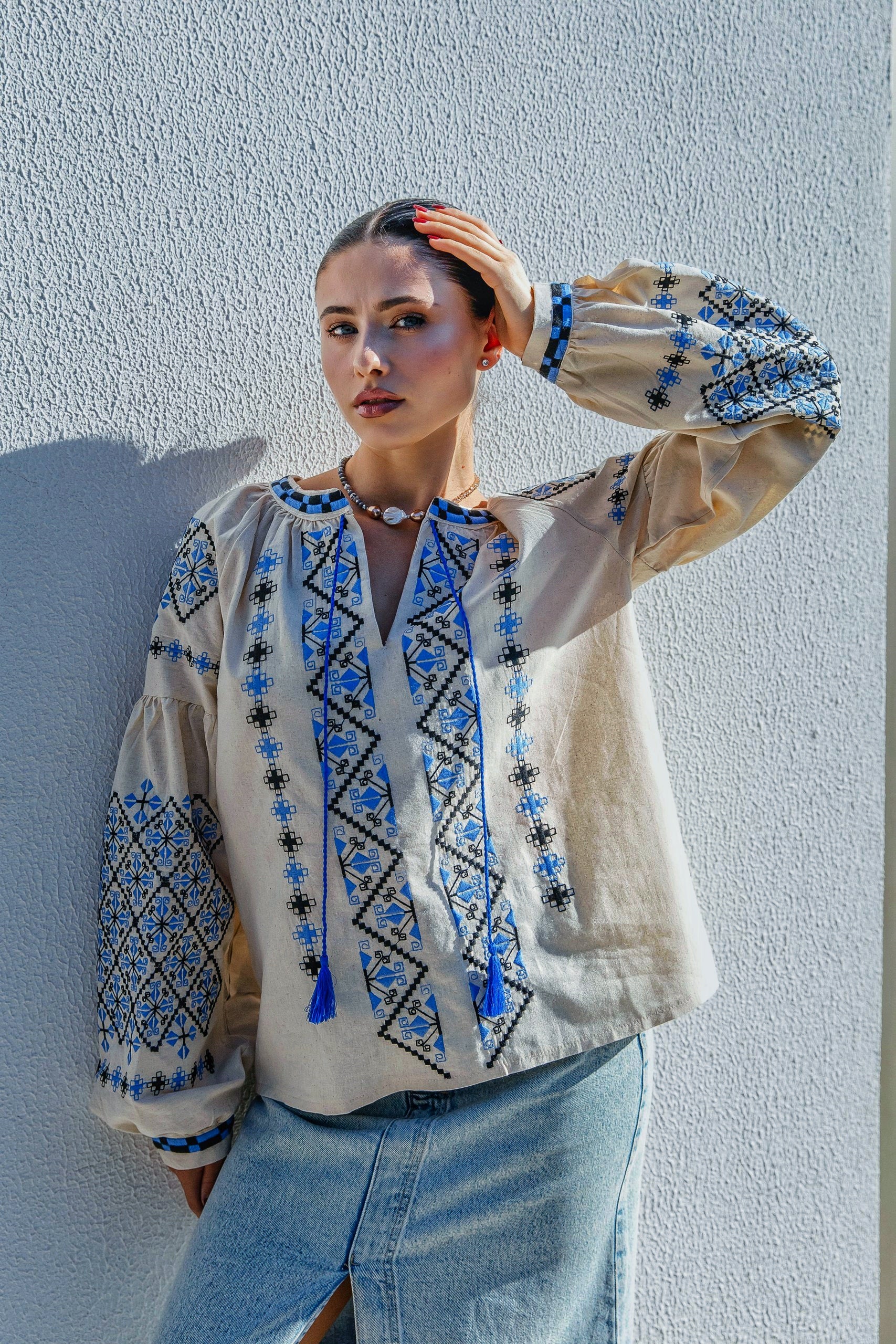 Blouse “Dyvotsvit” – Beige Linen Embroidered Blouse with Blue and Black Patterns and Tassels | Goya Concept