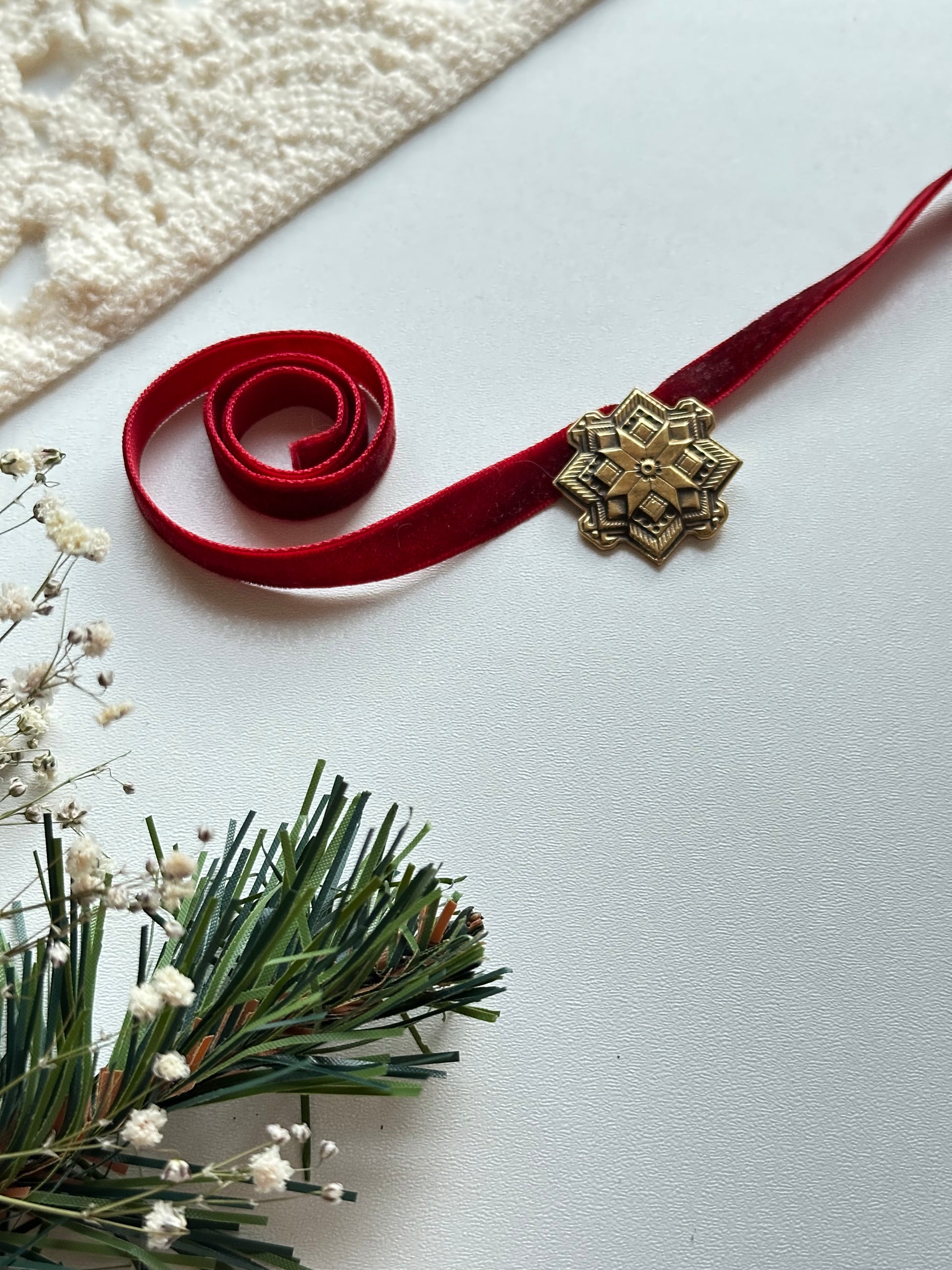 A cast brass star with clear geometric lines rests on a soft velvet ribbon, creating a tactile contrast that feels intentional and balanced.