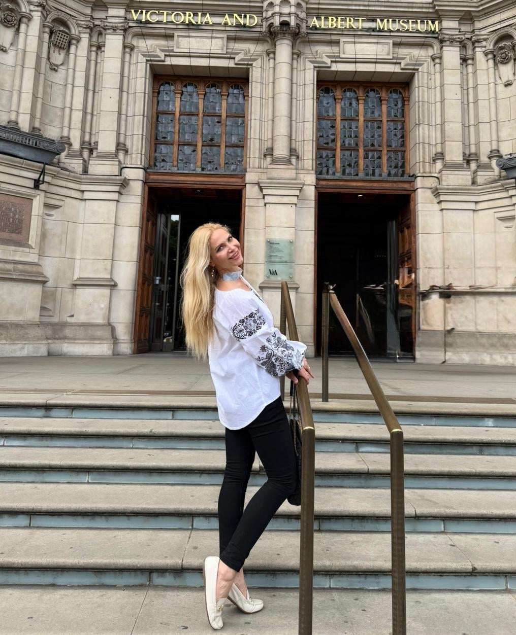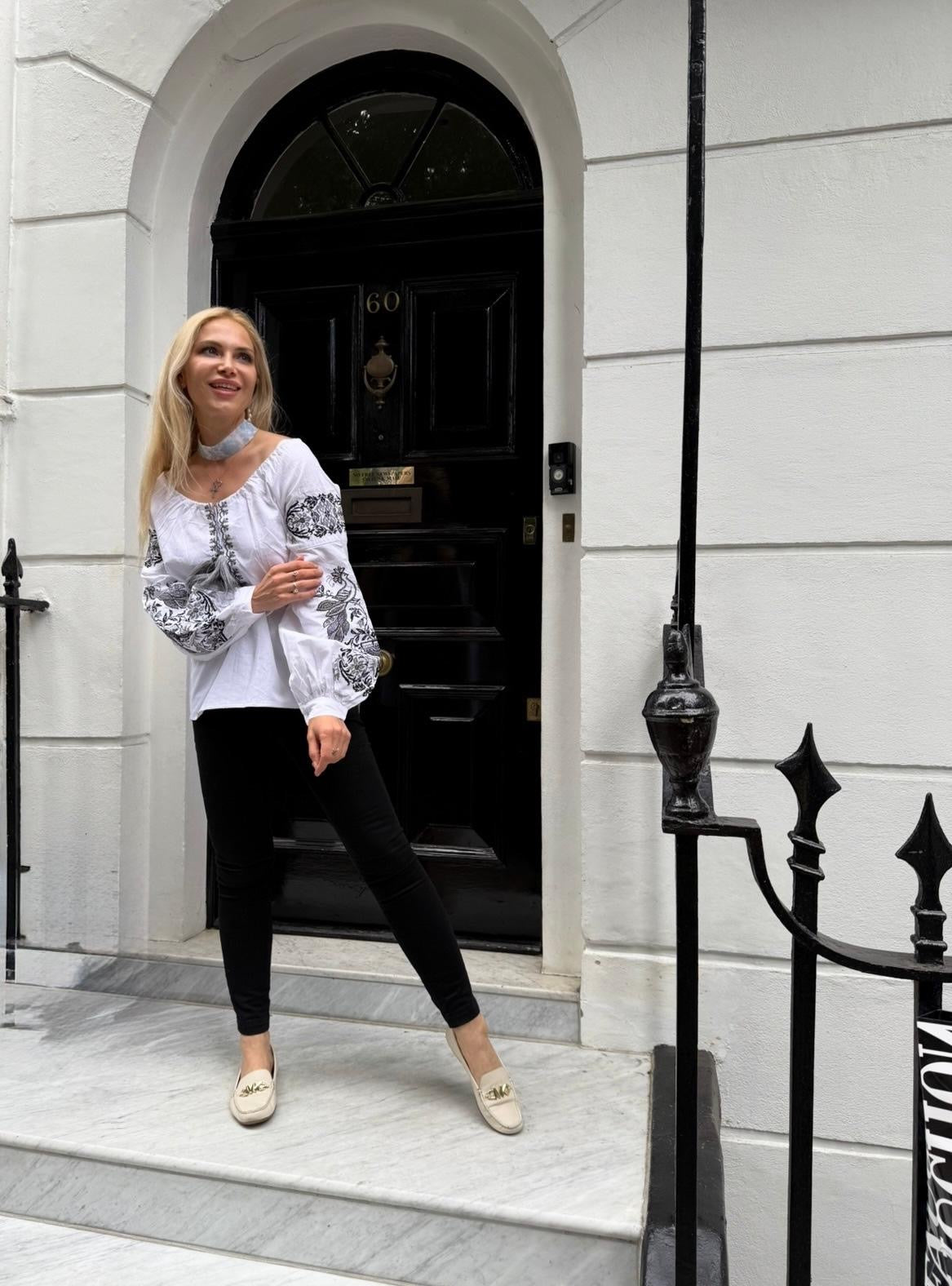 A modern Ukrainian embroidered blouse made of 100% natural cotton. This women’s white shirt features detailed black and grey embroidery in the shape of a stylized firebird (zhar-ptak), decorating the sleeves and front. A fresh take on traditional folk design — minimalist and wearable.