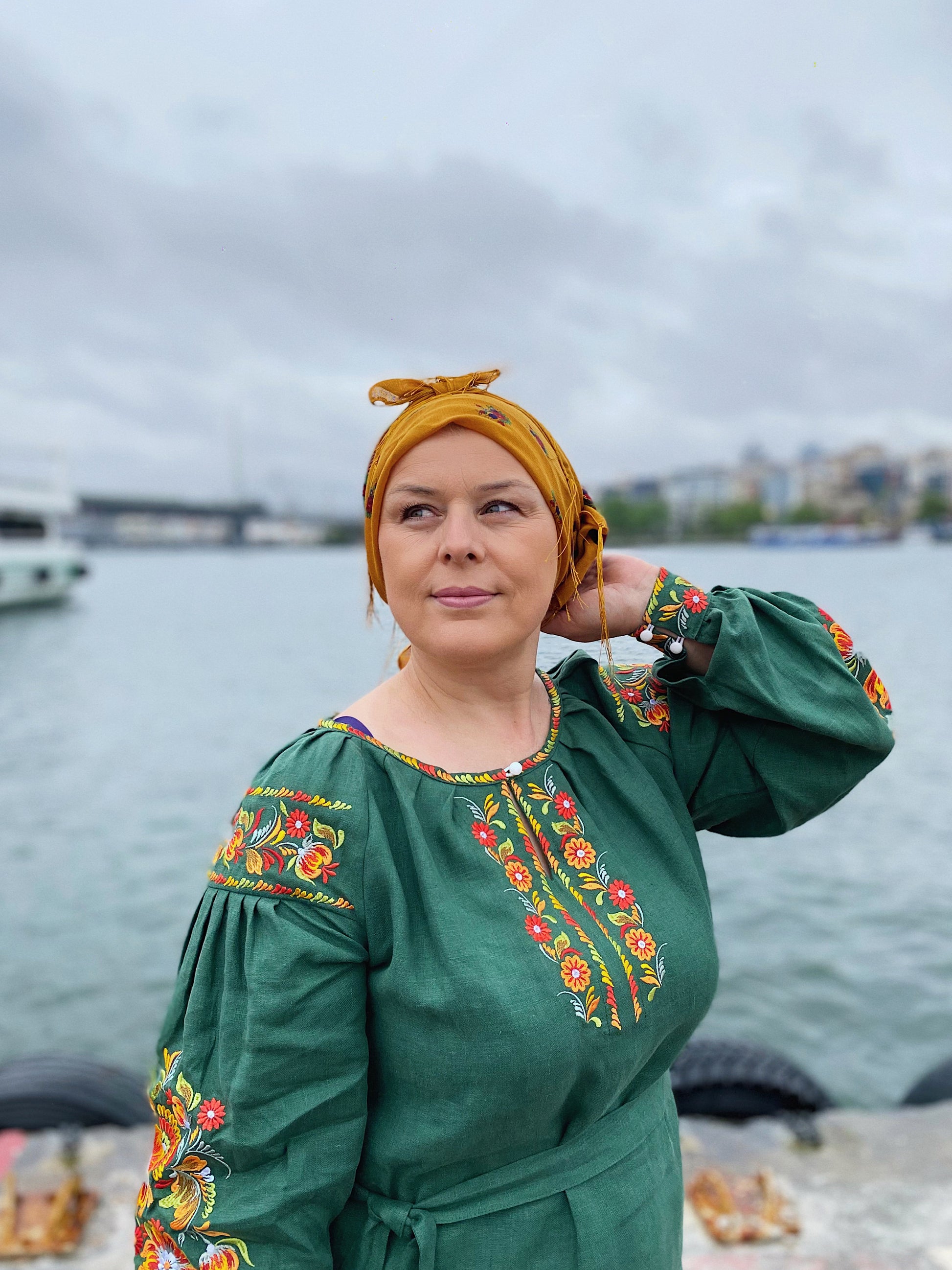 Vibrant floral embroidery blooms against the deep green linen, creating a look that is bold yet naturally refined.