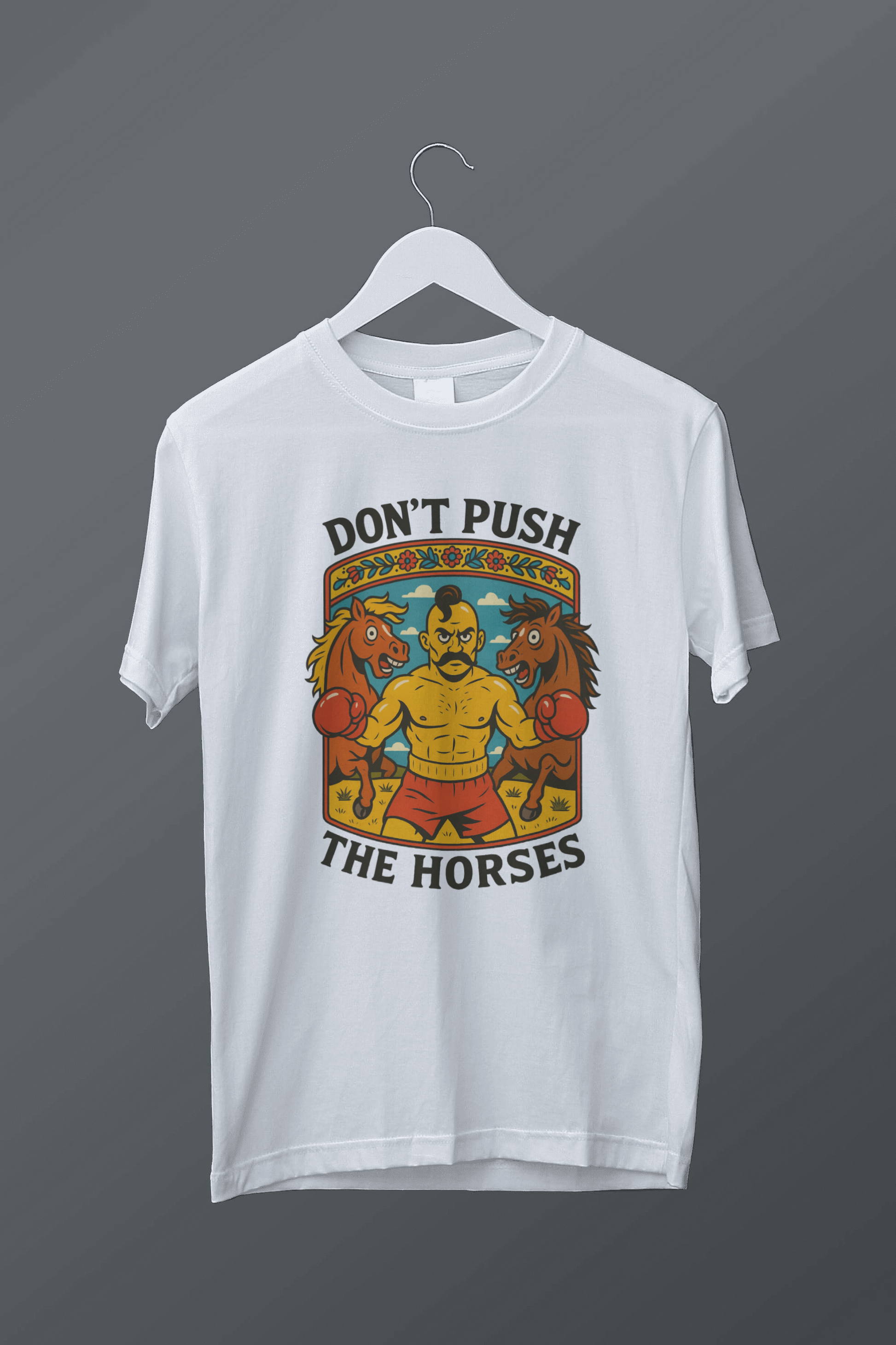 “DON’T PUSH THE HORSES” T-shirt — bold humor turned into a viral quote by boxing legend Oleksandr Usyk. A print with attitude: Cossack vibes, boxing spirit, and Ukrainian irony in one punch.