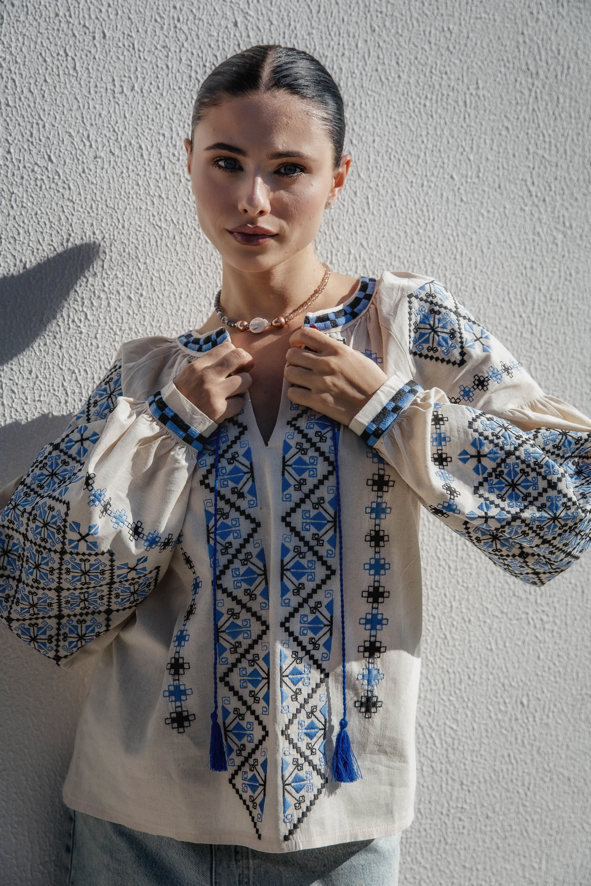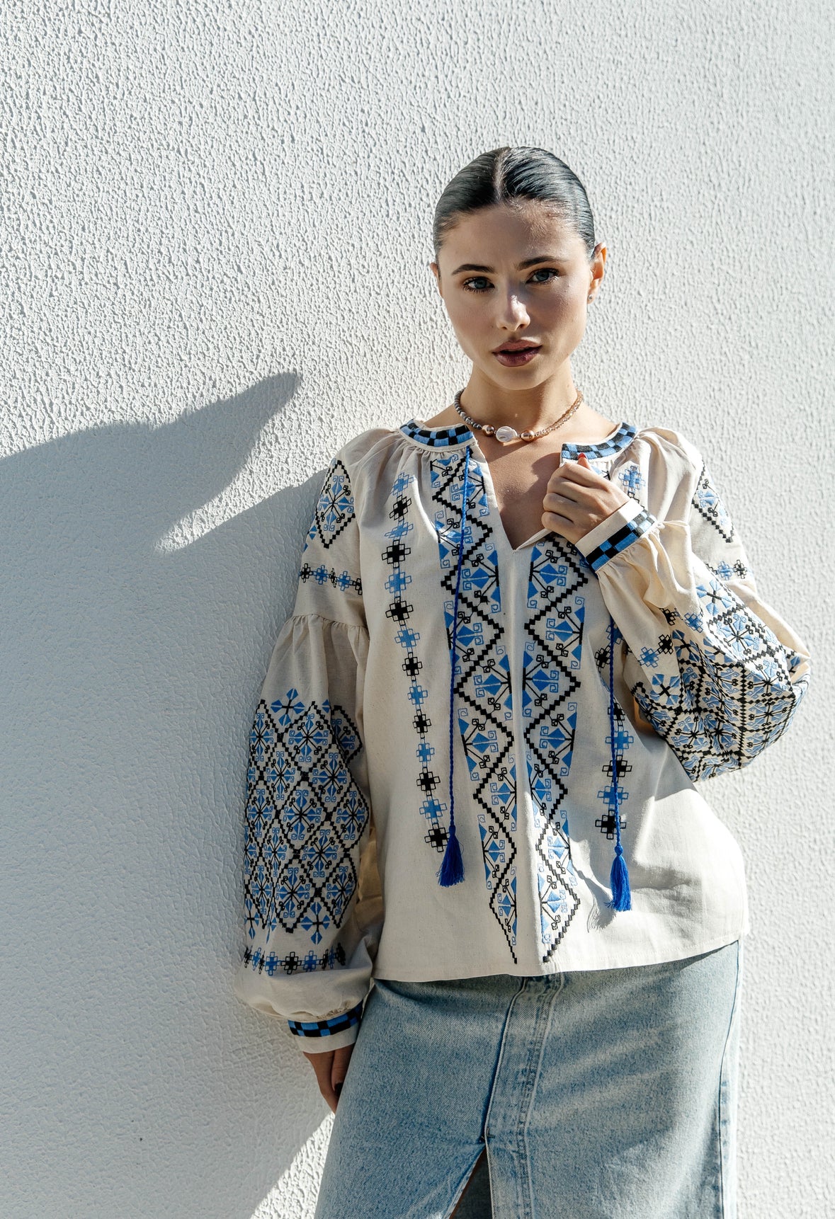 The combination of materials creates a clean, light line on the neck — restrained yet expressive. The choker pairs well with embroidered blouses, V-neck dresses, and minimalist tops.