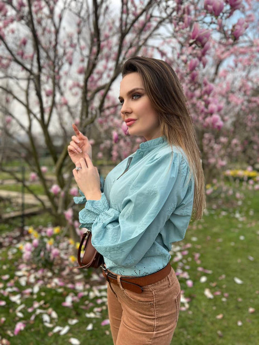 Блакитна джинсова сукня з темно-синьою вишивкою