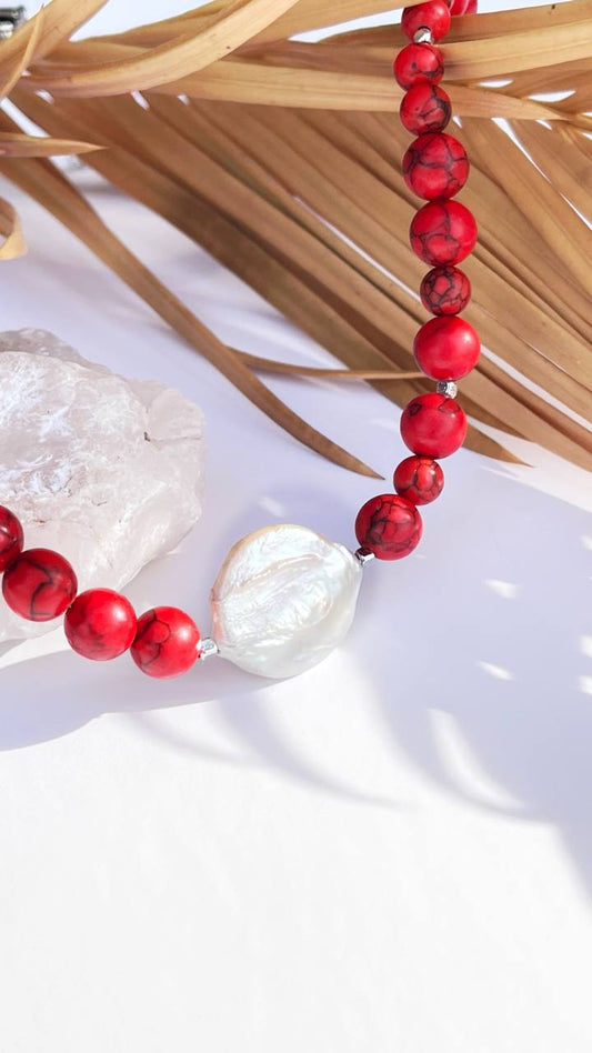 Червоний чокер «Спалах» з перлиною — намисто ручної роботи