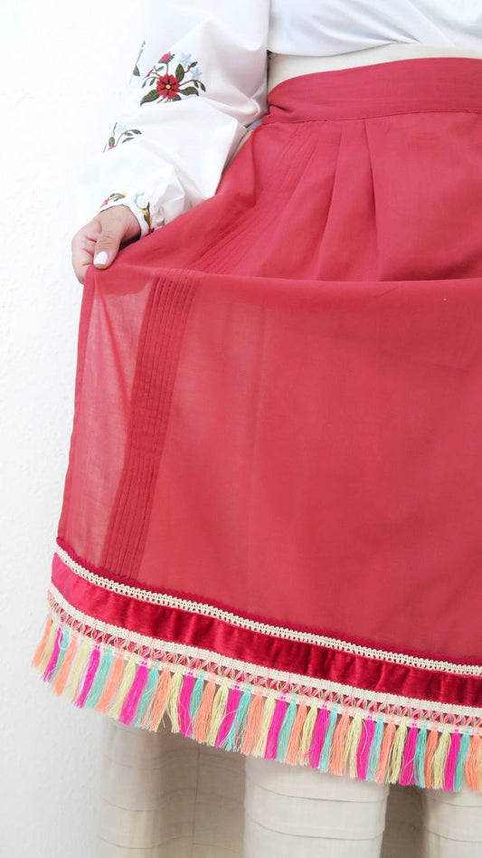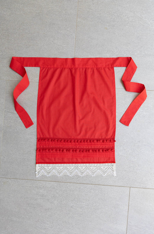 Червоний фартух у бохо-стилі "Кармін" / поясний аксесуар з бавовняним мереживом та помпонами.