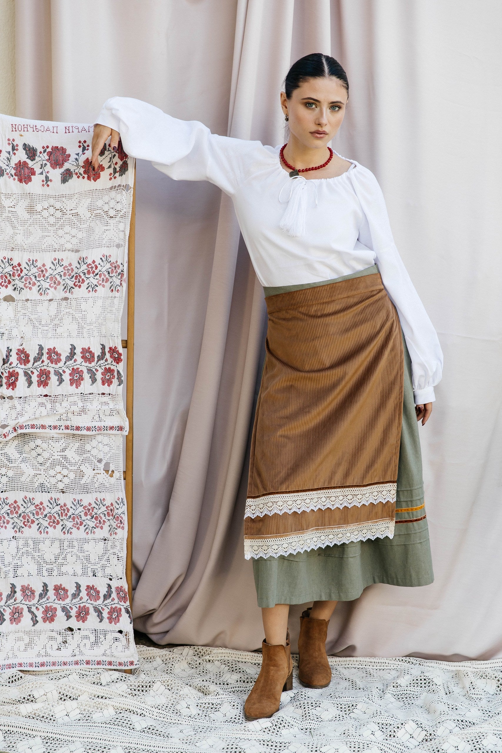 Chestnut Honey Velvet Apron – Mustard Waist Accessory with Cotton Lace and Velvet Ribbons | Goya Concept