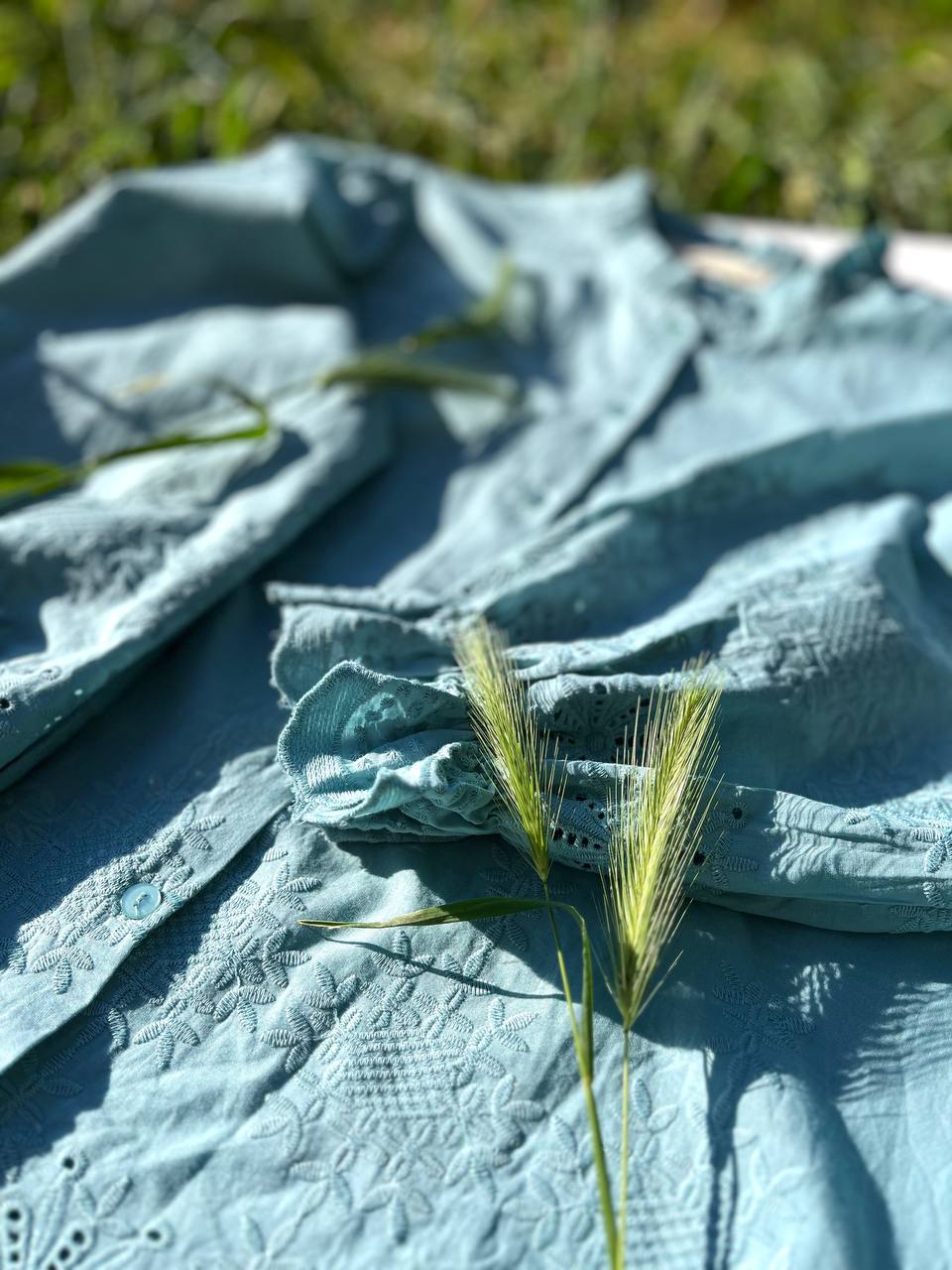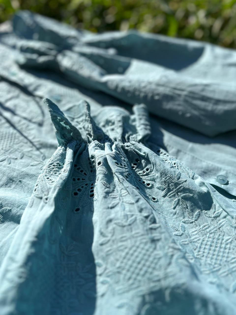 Сорочка "М'ятний Вінтаж" — елегантне поєднання бохо стилю та класичних вінтажних мотивів. Виконана з тканини з ажурною вишивкою м'ятного кольору, вона створює ефект легкості та ніжності. Повні довгі рукави з манжетами-рюшами додають цьому виробу романтичного вигляду.