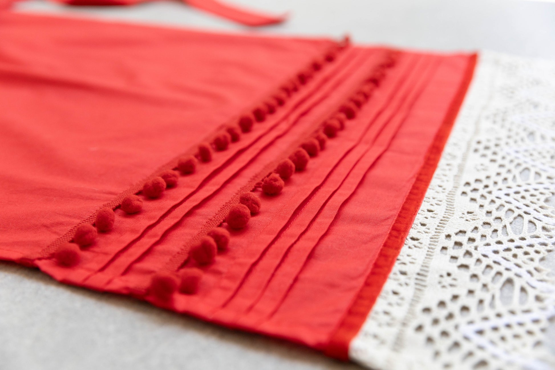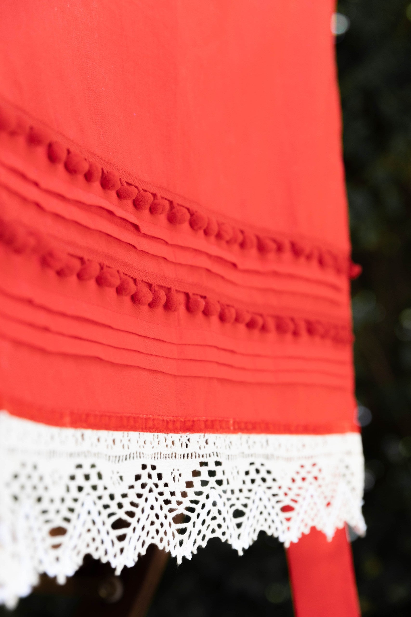 Червоний фартух у бохо-стилі "Кармін" / поясний аксесуар з бавовняним мереживом та помпонами.